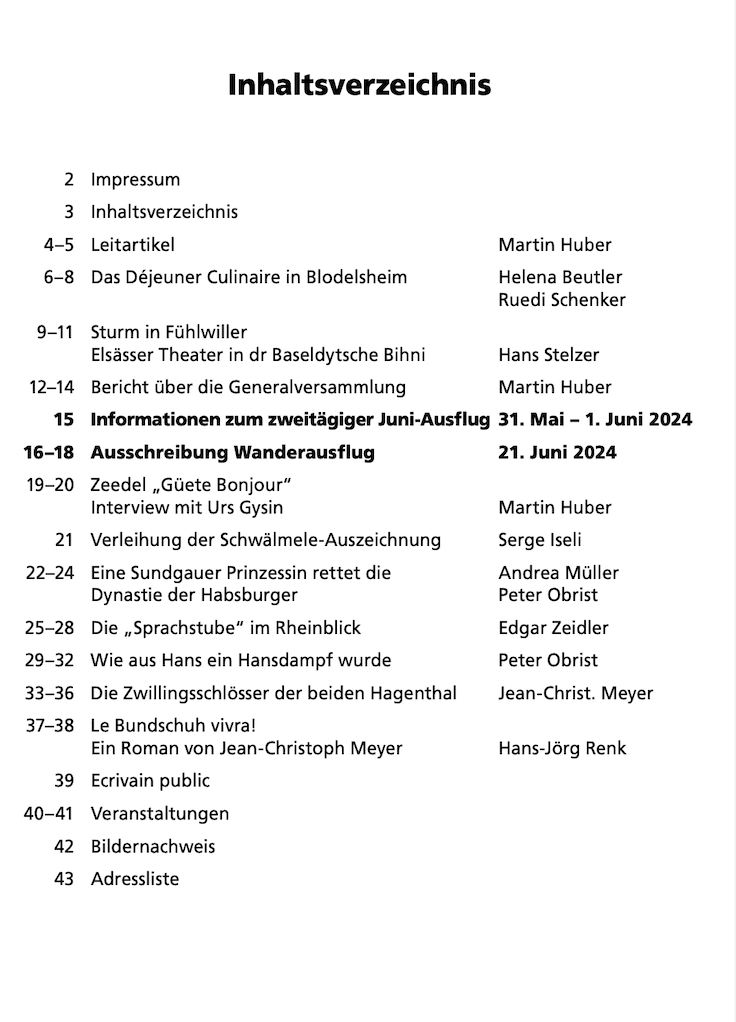 Jedes Mitglied des Kulturvereins Elsass-Freunde-Basel erhält die über 40-seitige Gazette viermal im Jahr zugestellt. Darin findet man eine Vielzahl von interessanten Artikeln über das Leben und die Geschichte des Dreylands.